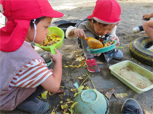 子どもたちは園庭に出ると様々な色や大きさの葉っぱを見つけて、集めたり何かに見立てて遊んだりと過ごしています。先日、年中:星組の子どもたちは、落ち葉を集めてキャンプごっこをしました。網のおもちゃに落ち葉を置いてお肉を焼いたり、細い枝を集めて焚き火をしていいたりと楽しく遊んでいました☆またタイヤの上に寝転がって空を見上げ、秋の空を眺めている姿もとても可愛らしかったです。