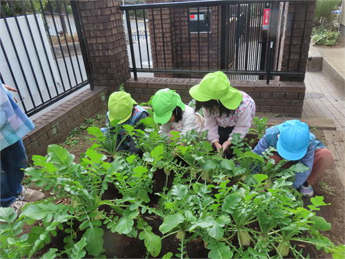 天使幼稚園では毎年、年長:月組さんが大根を育てています。その大根が大きく育ったので、先日収穫をすることができました。9月の終わりに種を蒔いてから、毎日当番の子が水をあげてクラスみんなで大切に育ててきました。成長した大根をみて「大きく育ったね!」と収穫するのを楽しみにしていました。そしてクラスみんなで力を合わせてたくさんの大根を収穫することができました!!