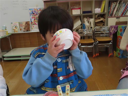 2部屋に分かれてクラス混合で食べました。隣に座っている月組さんが「どのくらい食べる?」「おかわりいる?」と優しく聞いてくれたので子どもたちは入れて欲しい量をリクエストして配膳してもらいました。食べている間も「美味しいね」「温まるね!」と嬉しい声がたくさん聞こえてきました。普段は少し苦手な野菜も“月組さんパワー”で「美味しい!!」と食べていた子どもたち。心も体もぽかぽか温まりました。