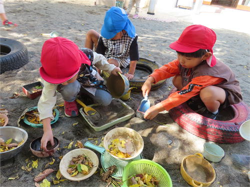 子どもたちは園庭に出ると様々な色や大きさの葉っぱを見つけて、集めたり何かに見立てて遊んだりと過ごしています。先日、年中:星組の子どもたちは、落ち葉を集めてキャンプごっこをしました。網のおもちゃに落ち葉を置いてお肉を焼いたり、細い枝を集めて焚き火をしていいたりと楽しく遊んでいました☆またタイヤの上に寝転がって空を見上げ、秋の空を眺めている姿もとても可愛らしかったです。