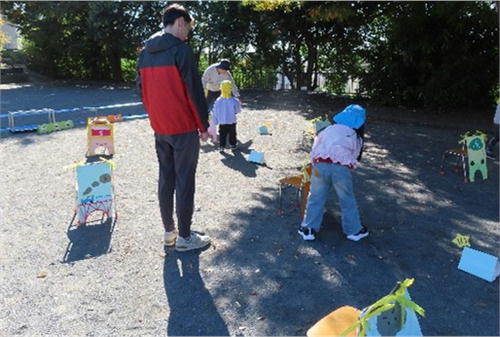 “てんしの広場”があり、幼稚園の前の公園で行いました。サッカーやテニス、ゴルフなど様々なスポーツをお家の方と一緒に楽しんでいただく行事です。色んなコーナーを回ったり、オリエンテーリング(公園の中にあるポイントを探して、シールを集めます!)を楽しんだり・・・気持ちの良い青空の下、子どもたちの嬉しそうな声が溢れていた一日でした。