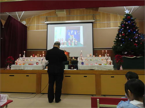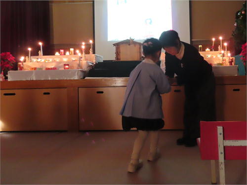 終業式では、少し早いですが・・・イエス様のお誕生をお祝いをしました。また今年も年長:月組がキャンドルサービスを行いました。年少:ちゅーりっぷ組と年中:星組のキャンドルも舞台の上に飾られました。子どもたち1人ひとりが作ったキャンドルに明かりが灯され、温かな雰囲気の中で藤が丘教会の鵜飼神父様と一緒にお祈りをし、クリスマスのお話を聞きながらイエス様のお誕生をお祝いしました。