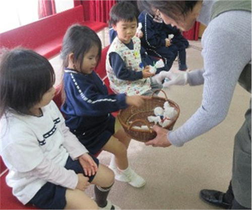 天使幼稚園の王様のお菓子遊びでは、一人一つずつ鈴カステラを選びます。鈴カステラの中に金平糖が入っていたら今日の“王様”“女王様”になります。朝から「当たるといいな~!」とわくわくどきどきしながら過ごしていた子どもたち。カステラを食べる時には「美味しいね!」と幸せそうな表情で話していたり、金平糖をすぐに見つけられるようにちょっとずつ食べ進めていたり・・・それぞれの姿が微笑ましかったです。みんなで食べていくと「当たった!」「金平糖入ってた♪」と嬉しそうな声が聞こえ、当たった子は王冠をかぶってみんなでお祝いをしました。