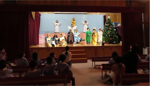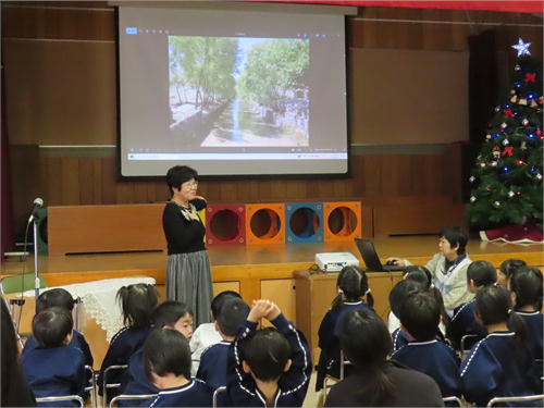 天使幼稚園ではクリスマスまでの間をイエス様をお迎えする心の準備をする期間として温かい気持ちで過ごそうと伝えています。その中で、『思いやり週間』としてアフガニスタンの人たちのために献金を集めています。みんなが集めた献金はアフガニスタンのために使われますが、その中で水路が作られた脇に“柳の木の苗木”を植えるためにそのお金が使われていたそうです。柳の木の根っこは水に向かって生えていくそうで、水路の石の壁を強くする役割がある、ということも教えていただきました。