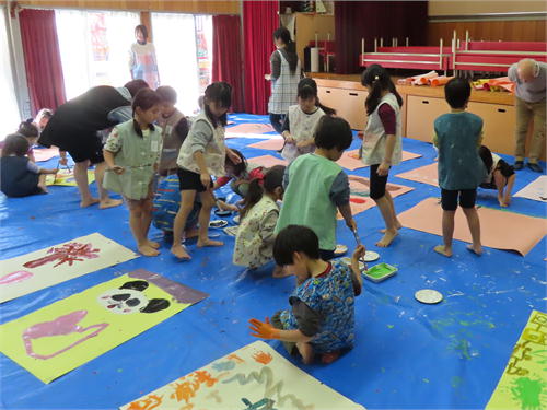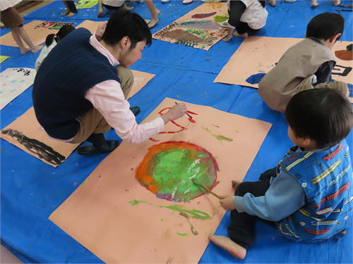 今回は体育館に模造紙を広げ、年長:月組と年中:星組の子どもたちは1人1枚、年少:ちゅーりっぷ組の子どもたちは2人で1枚使って大きな絵を描きました。普段は画用紙など決まった大きさの紙を使っていますが、今回は体いっぱい使って、思い思いの絵を描くことができました。手を伸ばしてダイナミックに描いたり、絵画展の方にアドバイスをもらいながら一緒に絵を仕上げたりと、子どもたちはとても楽しそうに取り組んでいました。絵の具で手が汚れることも気にせず、夢中になって筆を動かす姿が印象的でした。それぞれの個性が光る素敵な作品がたくさん生まれました♡