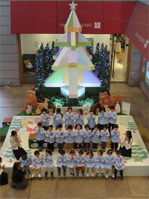この前の週末、青葉台の東急スクエアの大きなツリーの下で歌をうたいました。梅が丘天使幼稚園ではクリスマスは“サンタさんにプレゼントをもらう日”だけではなく“イエスさまのお誕生日”であることも伝えています。自分たちも「温かい気持ちをいろいろな方へプレゼントしよう!」張り切っていた子どもたち。素敵な歌声をお届けすることができました。
